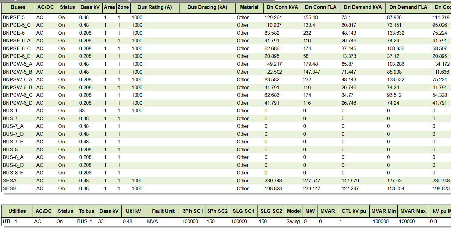This a report showing the data of the all the items in the one-line. The equipment types are divided into separate tabs. The first tab provides a summary of all the equipment items currently in the system. The other tabs separate the database items by equipment type.