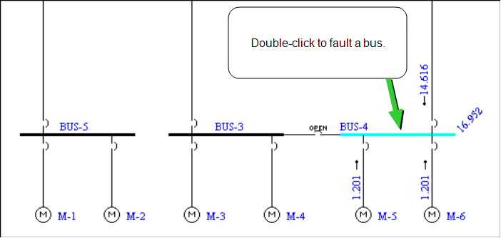 The results are immediately placed directly on the one-line. In this example, the faulted bus current is 16.952 kA, which is shown on the right-hand side of the bus at a forty-five degree angle. The contribution from the transformer above (not shown) is 14.616 kA, and the motor contribution is 1.201 kA.