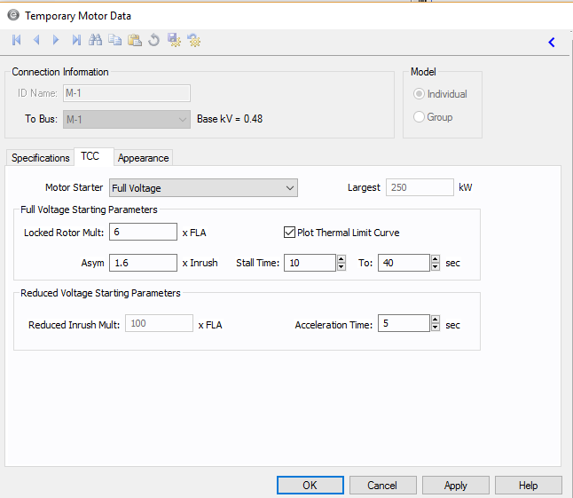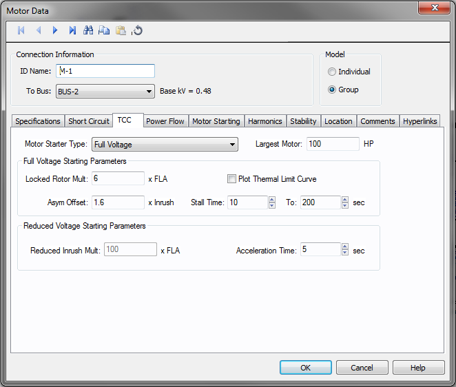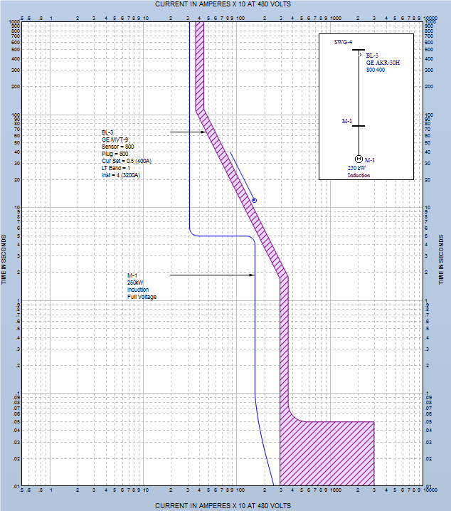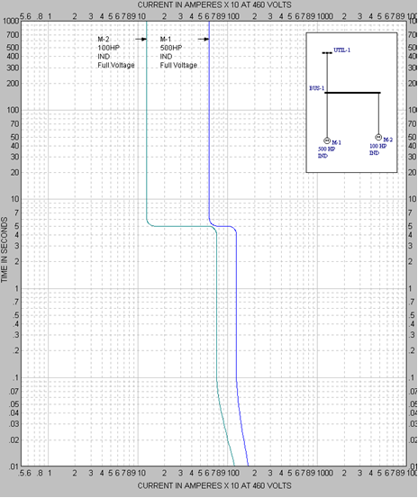 下面的图显示了一个50马力电动机的电动机起动曲线以及用于断路器的固态跳闸曲线。电动机的起动曲线参数在电机数据对话框中指定。绘制TCC之后,你可以打开临时电机数据对话框,然后为电动机的起动曲线更改参数。