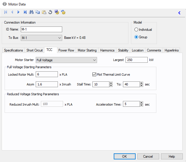 当绘制分组电机的起动曲线时,除个别电机所需的其他数据外,你需要指定最大的电机马力。该图假定最大电机正在启动,并且其余电机已经稳态运行。图中的电流计算如下: