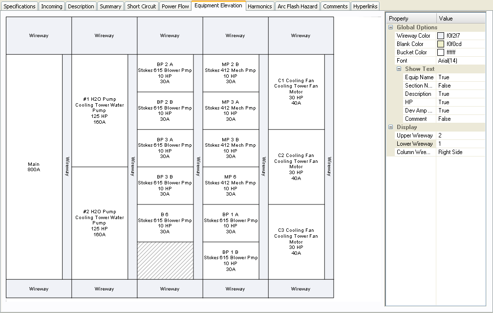 Ver la siguiente imagen de la Vista frontal de equipo (Equipment Elevation) y la pestaña correspondiente Cuadro eléctrico (Panelboard).