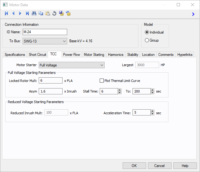 Proporciona una forma fácil de ajustar la potencia total de motores utilizada en la determinación de las corrientes de cortocircuito. Al cambiar el porcentaje conectado, el HP real (valor total conectado) que escribió en el campo de Hp puede permanecer estática. Esto reduce los errores de modelado y elimina varias bases de datos para diferentes contingencias. Por ejemplo, un CCM tiene un grupo de motores de inducción (todas mayores de 50 HP) que se suman a una carga total de 600 HP. Sin embargo, 300 HP se considera copia de seguridad y no está en línea. Con el fin de mantener registros adecuados del HP del CCM, 600 sería escrito en el campo de HP. Dado que sólo 300 HP está girando en un momento dado y puede contribuir corriente de cortocircuito, el campo conectado está ajustado a 50%. |