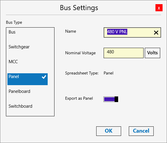 This option is available only if the MCC or panel has a corresponding spreadsheet. If there is no spreadsheet, the MCC or panel is exported as a bus.