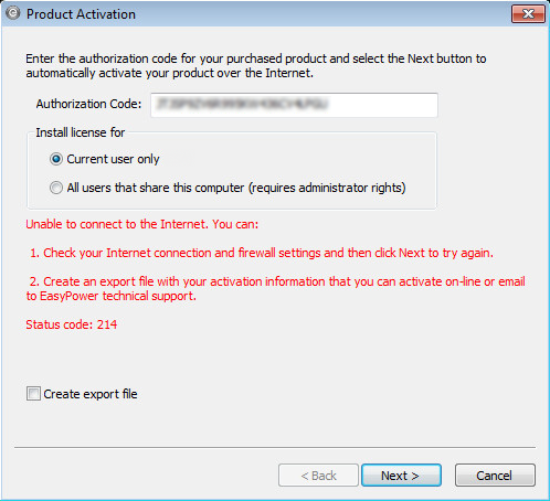 An Internet connection is required to activate your EasyPower software. If you do not have an Internet connection, you will receive an error message when you attempt to activate the software by clicking Next in the Product Activation dialog box.