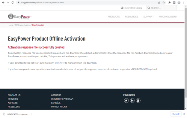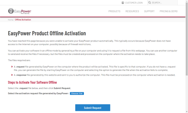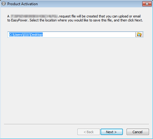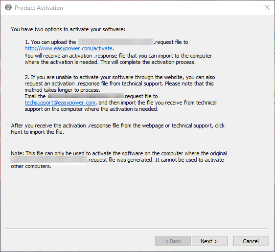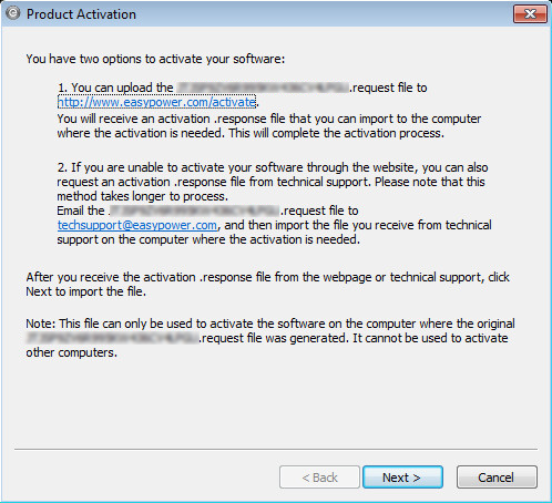 On a computer that has an internet connection, you can email the .request file to support@easypower.com. You will receive a file from technical support that you can import to the computer where the activation is needed. However, this step takes longer to process than the other option.