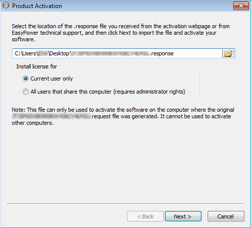 - In the Product Activation dialog box, click the Folder icon to browse to the location of the .response file you received from the web page or technical support and copied previously. Select whether you want to install the license for only the current user or for all users, and then click Next.