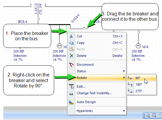 Right-click on the breaker you just added. Select Rotate > 90°. The breaker orientation changes from vertical to horizontal. At the same time, the connection type of the breaker changes from feeder breaker to bus tie breaker. Drag the tie breaker's remaining leader to the bottom right bus. After it connects, drag the tie breaker's symbol so it is centered between the two buses.