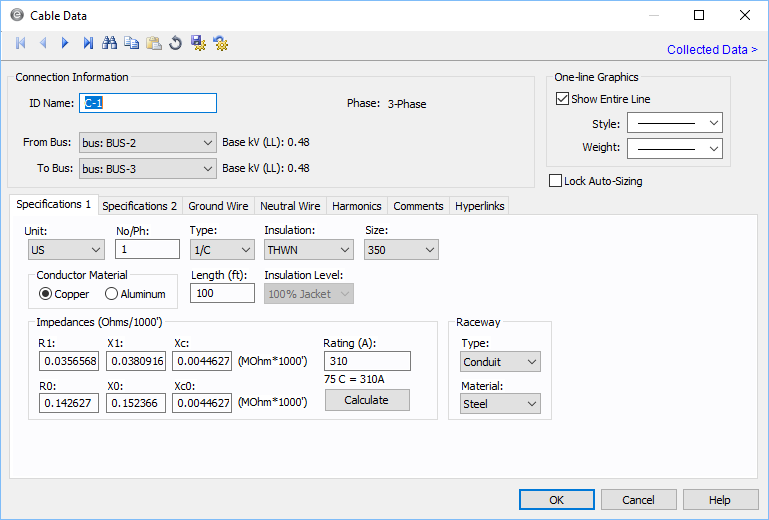 Double-click on one of the cables and fill out the dialog box as shown here. Do not change the To Bus or From Bus fields, because that would change the one-line connections. Fill out the Impedance fields last by clicking the Calculate button. After you have the data entered, click OK.