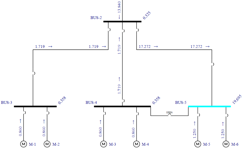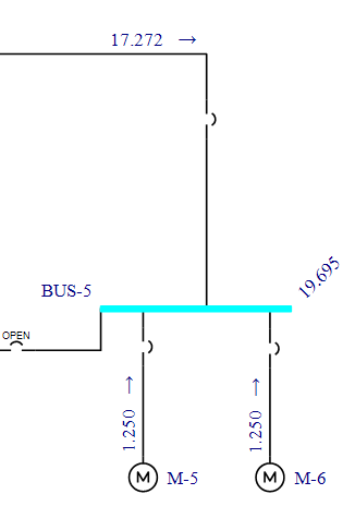 Note that the faulted bus is highlighted in blue. The default result units are symmetrical kilo-amps. (You can change this by clicking Tools > Short Circuit Options > One-line Output.) The faulted bus current is 19.490 kA, which is shown on the right-hand side of the bus at a forty-five degree angle. The contribution from the transformer is 17.066 kA, and the motor contribution is 1.250 kA.