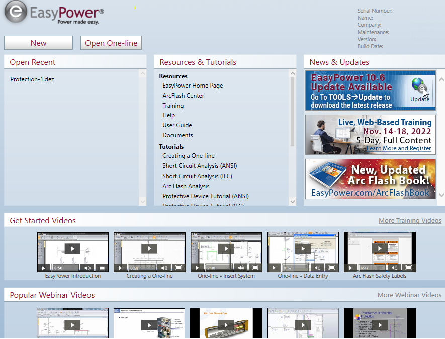 This area displays a list of webinar videos that describe advanced EasyPower features. Click More Webinar Videos to open a web page with a larger selection of video content. Note: The videos are hosted online and require an Internet connection. |