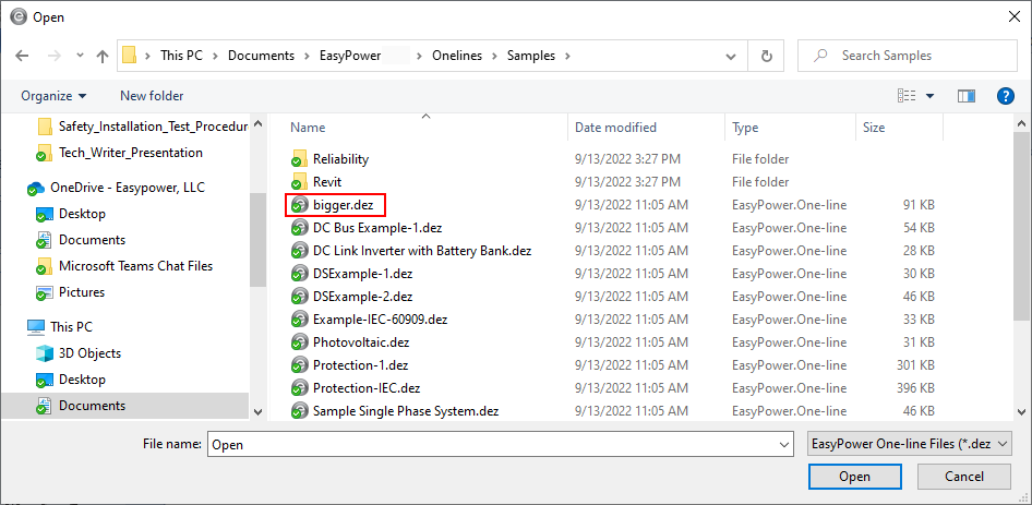 Click File > Open to select another database. EasyPower opens the Onelines folder in your Documents library. Open the Samples folder, and then double-click the Bigger.dez database.