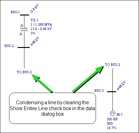Long cables, transmission lines, and busways can be shown as short lines hanging from a bus with the opposite bus labeled on the one-line. This is useful when a line stretches across the one-line and it would take extra work to make room for it. Condensed lines are created by clearing the Show Entire Line check box in the line data dialog boxes. You can resize a condensed line on the one-line.