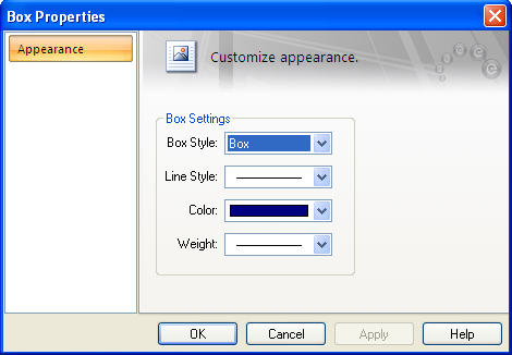 To format the box properties, double-click on the box edge. The Box Properties dialog box appears, in which you can set the Style, Color and Weight of the edges of the box.