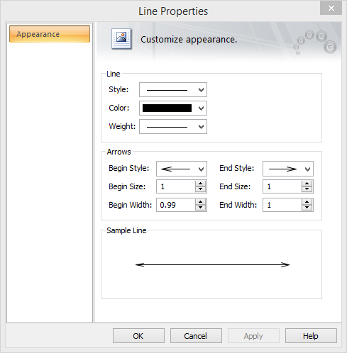 To format the line properties, double-click on the line. The Line Properties dialog box appears, in which you can set the Style, Color and Weight of the line as well as the appearance of the arrows on either end of the line.