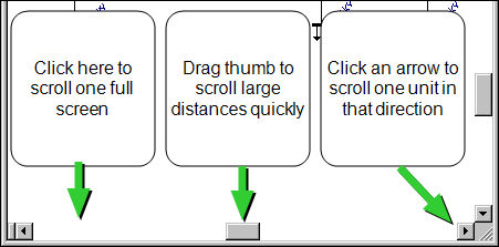 The scroll arrows are the buttons at each end of a scroll bar. Clicking on a scroll arrow once causes the view to move one unit in that direction. Holding down the mouse button causes the view to move until you release it. Pressing one of the keyboard's arrow keys has the same effect as clicking on the corresponding scroll arrows.