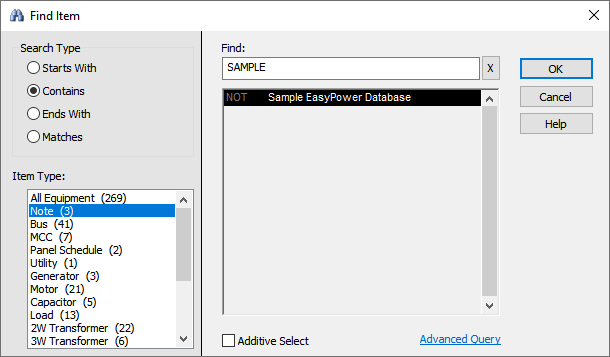 Select the Item Type of Note, and then in the Find box, type the text for which you are searching. The item type of Note is displayed when there are notes on the one-line.