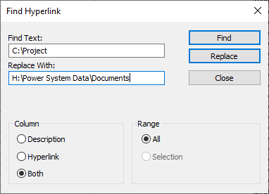You can change the path name of the hyperlink globally by clicking Find. This displays the Find Hyperlink dialog box. You can replace the text in the path name to change the path of the hyperlink.