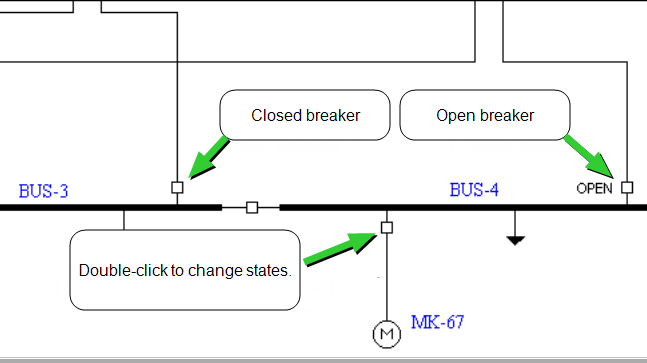 To open or close a breaker with SmartBreaker™, double-click on the breaker while you are in an analysis focus. The breaker instantly changes states. If the breaker is open, an "OPEN" text label is displayed. If the breaker is closed, no label is displayed. SmartBreaker™ also applies to switches and fused switches.