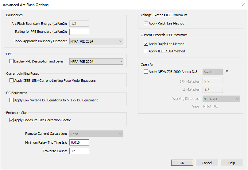 You can apply the Ralph Lee method (default) or clear the check box to omit calculations. For arc flash standard NFPA 70E D.2 D.3, this setting is not applicable. |