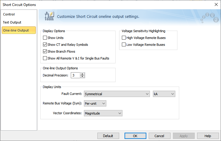 Figure 1: One-line Output Tab of the Short Circuit Options Dialog Box