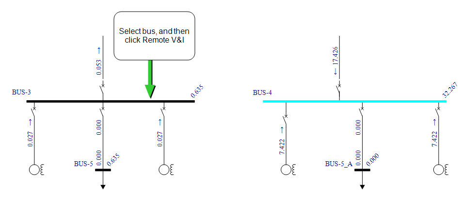 Voltages for each bus and the currents for each branch connecting to the bus are displayed. In this example, 0.027 kA from each of the motors flow to the fault on BUS‑4. For remote buses, the voltage is shown to the right of the bus at an angle. At BUS-3 in the example above, the value is .635 per-unit, or about 64 percent of nominal.