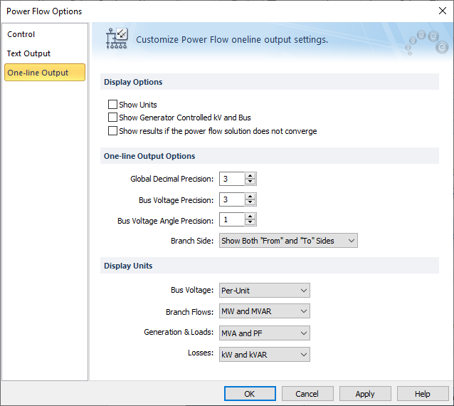 Select the One-line Output tab to determine the type of results that are displayed on the one-line during power flow analysis.