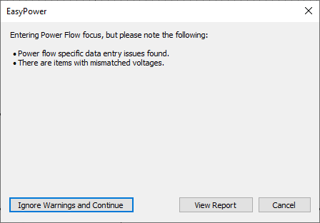 When you first enter the Power Flow focus, the program checks to see that all information required for power flow analysis has been entered. If information is missing, the program displays the following message: