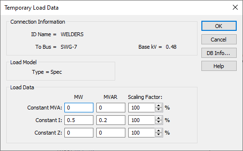 - Scaling factor: Each load can be varied by applying a different scaling factor. This lets you model the actual panel or lumped load on a bus, then study different loading conditions. This enables quick "what if" studies and prevents errors that occur from data entry.