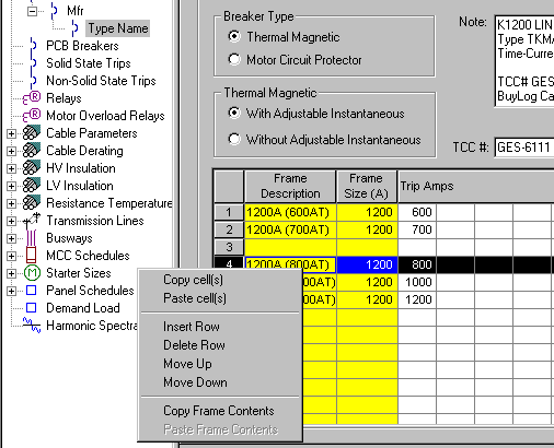Insert Row: EasyPower gives you the ability to insert a row anywhere in the spreadsheets in the device library. Using the right mouse button, select the row or cell directly above which you want to insert the new row. From the edit options that appear, select Insert Row. The Insert Row menu feature may not be available for all spreadsheets. This is true for those spreadsheets in which the rows are sorted automatically by style names. In such cases a new row will automatically be created below the last row when data is entered in the last row.