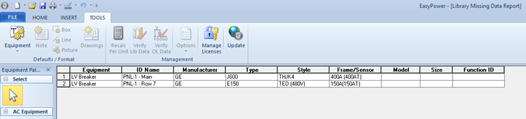 on the Tools tab to identify where your device library is missing data for your protective devices. The program produces a report that identifies where data is missing. This can occur if you are opening an older database and the library data is no longer available.