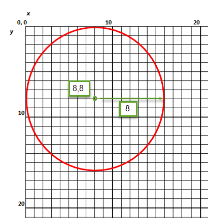 The x and y coordinates determine the center of the circle. The radius originates from the center of the circle. This means that the center of the circle is at coordinates 8,8, and there are 8 grid points on each side of the center to the edge of the circle.