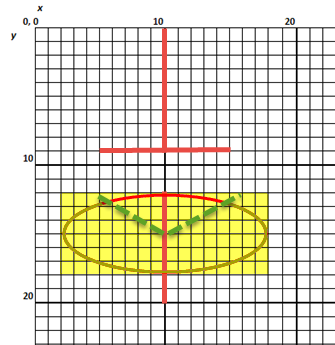 The first three "Line" values define the straight lines in the symbol. The last set of "Arc" values define the curved line in the symbol. The example below displays the entire elliptical circle that creates the curve, but only the portion between the green dotted lines (defined by the start and sweep angles) are actually displayed in the final symbol. The yellow highlighted area indicates the width (12 grid points) and the height (6 grid points) that determine the overall shape of the ellipse.