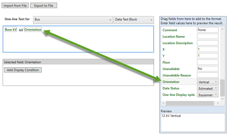 - You can type static text in the format box, if desired. Use the Preview area to monitor spacing. In the example in the figure above, "kV" is static text. "Vertical" is variable text that could change depending on the orientation data entered in the Bus Data dialog box.
