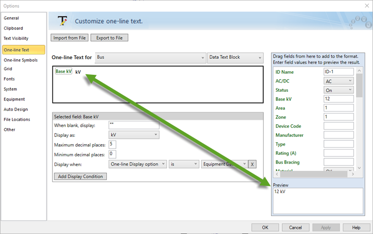 Note: The preview text is only used as an example. The actual text that appears on the one-line is based on the information entered in the item's data dialog box.