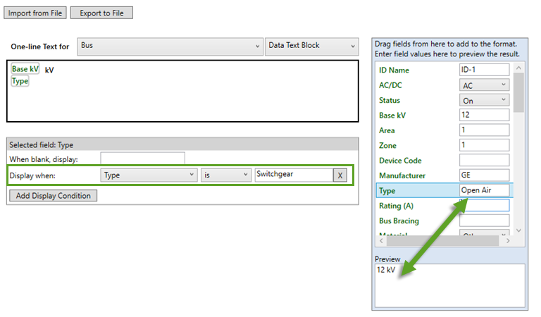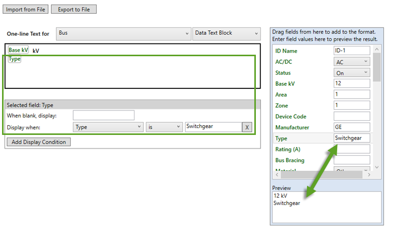 - Use the column on the right to set preview values and to see a preview of your changes. In the example below, we have added the field Type to the format box and set a display condition to display the text if the value is set to "Switchgear." In the preview area, the text "Switchgear" appears. If you type a different preview value next to Type, the value no longer appears in the preview.