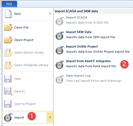 Note: You can also export from Revit and import into EasyPower in a single step by selecting Open in EasyPower from within Revit. This is typically only done the first time you create the EasyPower one-line. See Opening EasyPower from Revit for information. To update an existing EasyPower one-line, use the Export to File option instead.