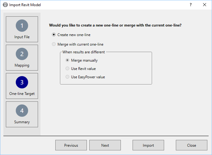 - For subsequent imports, you can merge the imported data with an existing one-line and select which results you want to save if results are different. See Merging Revit Data to EasyPower for more information.