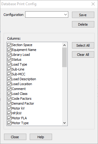 To create a new configuration, click Configure. In the Database Print Config dialog box, type the new configuration name in the Configuration box, and select the desired column headings in the Columns pane.