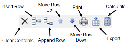 There are additional icons in the toolbar that are specific to MCCs and panel spreadsheets. These include the ability to manipulate the rows (clear contents, insert rows, or move rows), to print or export the spreadsheet, and to perform calculations on selected cells in the spreadsheet.