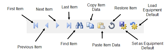 The database dialog box toolbar enables you to move easily through similar items in the database (all buses, for example). You can use it to copy and paste data as well as save and read equipment default data.