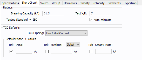 You can clip the time current curve (TCC) for the breaker at the specified current in kA. Select <None> to avoid clipping of TCC.