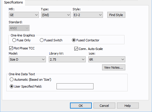 Choose the section of the library the fuse data is entered. In most cases, the selected Library kV is approximately the base kV of the fuse. For LV fuses, this field is blank. |