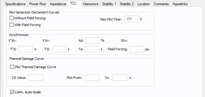 When this check box is selected, the program automatically scales the TCC curves based on the phase connection type. Traditionally, for 3PH curves in a TCC, scaling the curves based on the reference voltage is adequate. If a line-to-neutral connected 1PH device is to be plotted with an upstream 3PH device, then the LN connected 1PH curve needs to be shifted by a factor of the SQRT(3) in addition to the voltage-based scaling. Similarly, if a line-to-neutral connected 1PH device is to be plotted with an upstream 1PH-3W device, then the LN connected 1PH curve needs to be shifted by a factor of the 2 in addition to the voltage-based scaling.When the check box is not selected, scaling based on the phase connection type is not applied. The check box status for individually stored TCC plots can be different. The default for new TCC plots is obtained from the database for the device. |