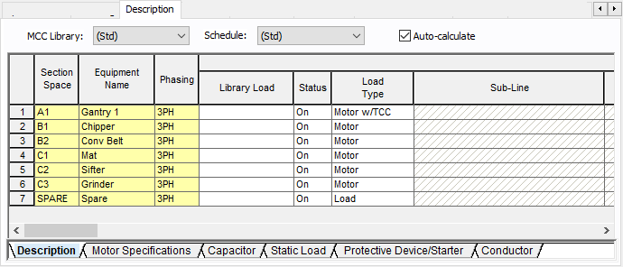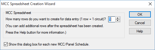 This is a spreadsheet listing similar to the Device Library. When you place a new MCC on the one-line, the first time you open its database dialog and click on the Description tab, EasyPower displays the MCC Spreadsheet Creation Wizard which enables you to select the number of rows you want. Clear the check box at the bottom of the Wizard dialog if you don't want it to appear with each new MCC. You can insert or append new rows in the spreadsheet if you need them later.