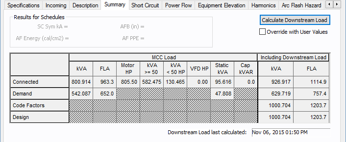 The Summary tab of MCC Data dialog box provides the total load on the MCC and the load that must be used in designing.