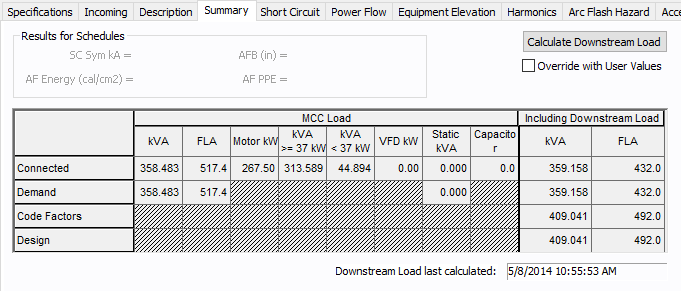 Total kVA load calculated. You can enter your own values in these fields by selecting the check box for Override with User Values. |