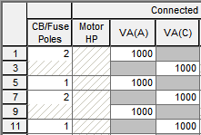 The phases and number of poles for the circuit affect the panel row behavior. Below is an image of a three-phase panel with a mixture of poles. When the Fixed Phase Arrangement check box is selected, the phases appear diagonally for each row, with phase A in the first row in the first column, phase B in the second row in the second column, and phase C in the third row in the third column. This phase pattern repeats throughout the spreadsheet.