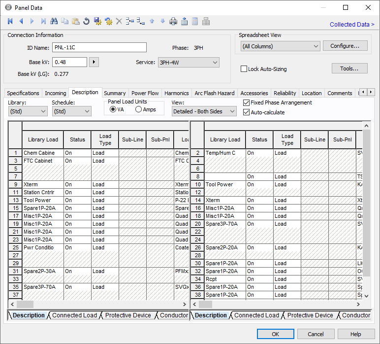 When you click on the Description tab, additional buttons become available on the toolbar. These enable you to perform actions related to the spreadsheet. See Additional MCC and Panel Spreadsheet Options for more information.