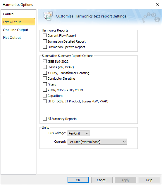 Harmonics Options, and click the Text Output tab to select output report types. You can also click