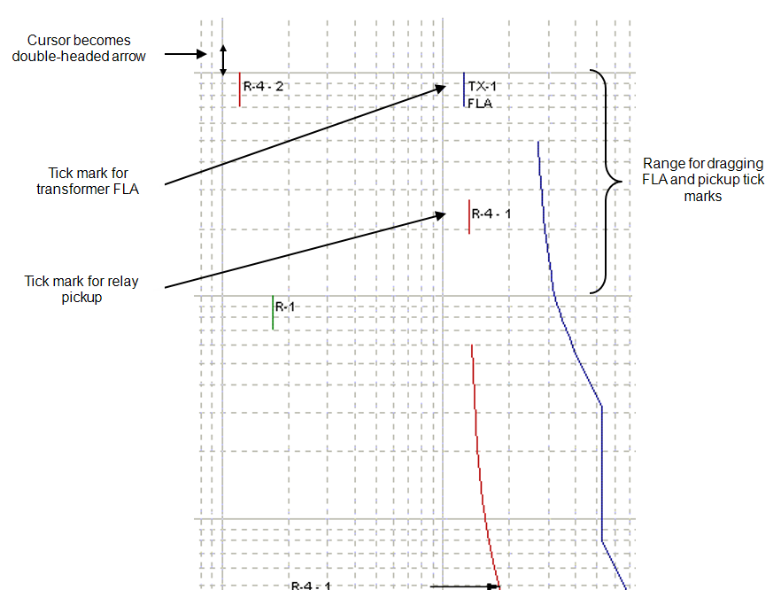 You can drag these tick marks up or down within a decade of time interval. To drag the pickup or FLA tick marks, move the pointer arrow over the tip of the tick mark so that a double-headed vertical arrow appears. Drag the tick mark up or down by left-clicking.